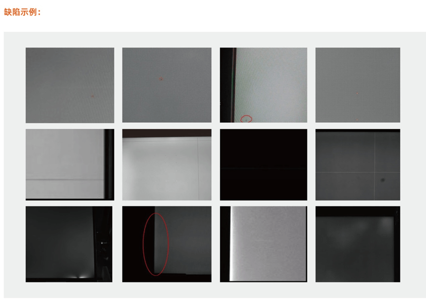 常见的显示屏显示缺陷可分为:点缺陷、线缺路、MURA缺陷三大类。这些缺陷可通过人眼在特定条件下分辨出来,因此传统的显示缺陷检测只常由人工来完成。但人工检测无法精准客观地检测微小物体和MURA缺陷,且易受人眼容易疲劳等主观因素影响,存在很大的局限性。